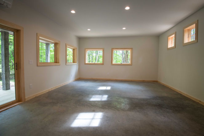 This 1,900 sf single-family residence is a house meant for the woods, but it's also designed to minimize interaction with the road. The wood siding is stained shades of gray and brown to blend in with the forest colors, and be less visible. A covered porch and big windows in the back open onto a glade of maple trees, while on the front side, the first floor windows are small and high to provide privacy. The house is also a blend of styles, with the first floor being more modern, and the second floor a more traditional vernacular style.